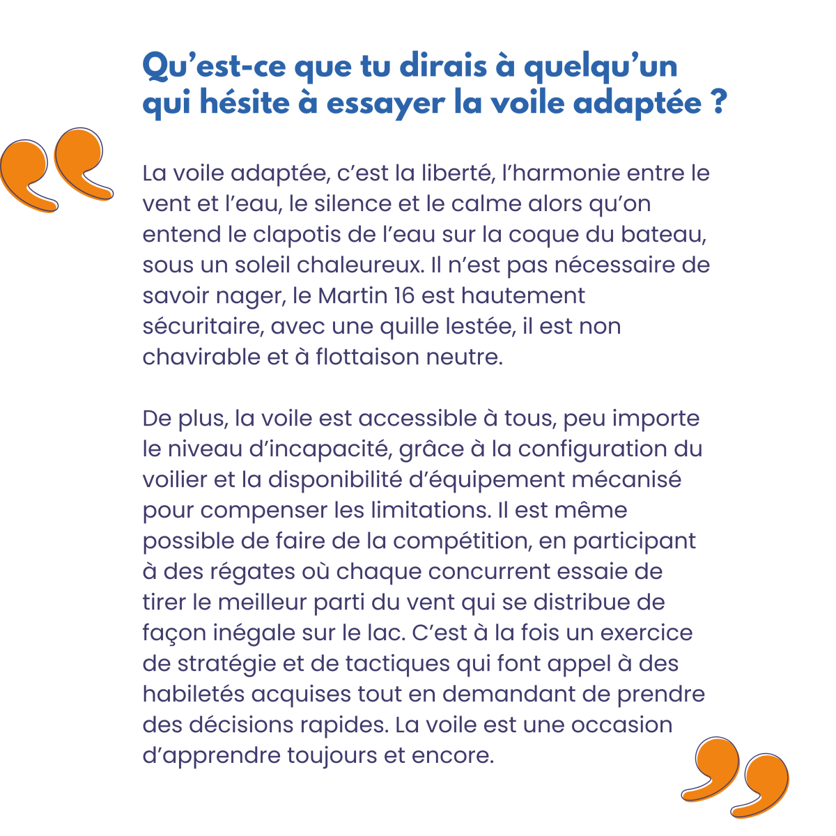« En fauteuil roulant, je me sens très limité… mais dans le bateau, j'ai l'impression de flotter dans les airs. Je me sens libre ! »